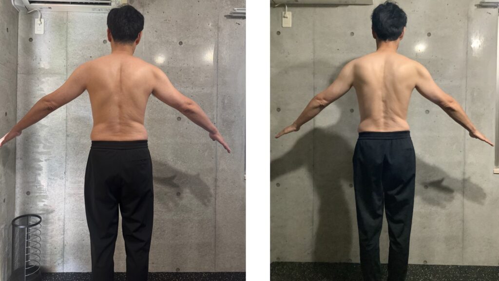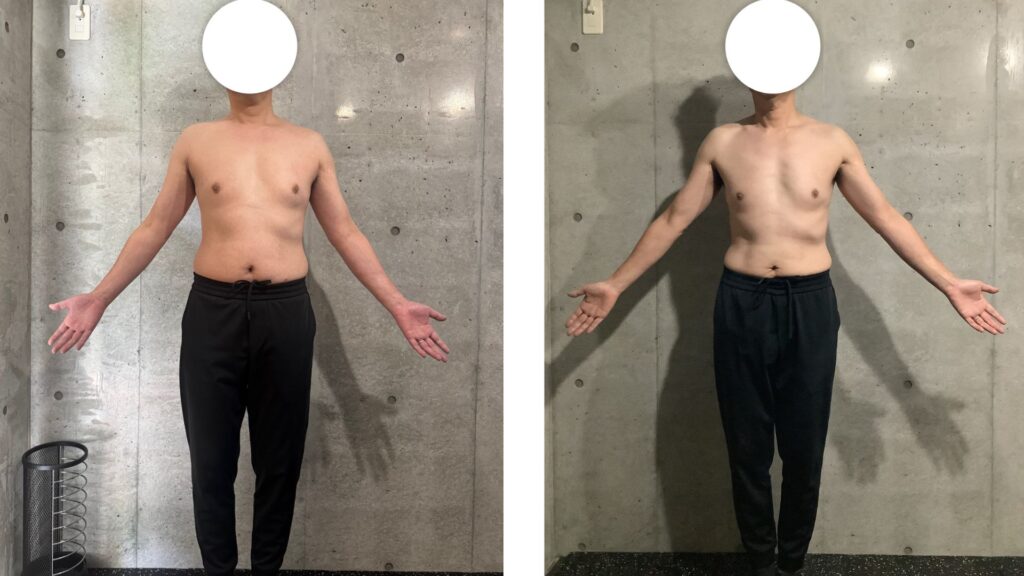 体重・体脂肪・ウエストの全てで大幅な改善が見られ、姿勢の変化も相まって見た目が劇的に変わりました。