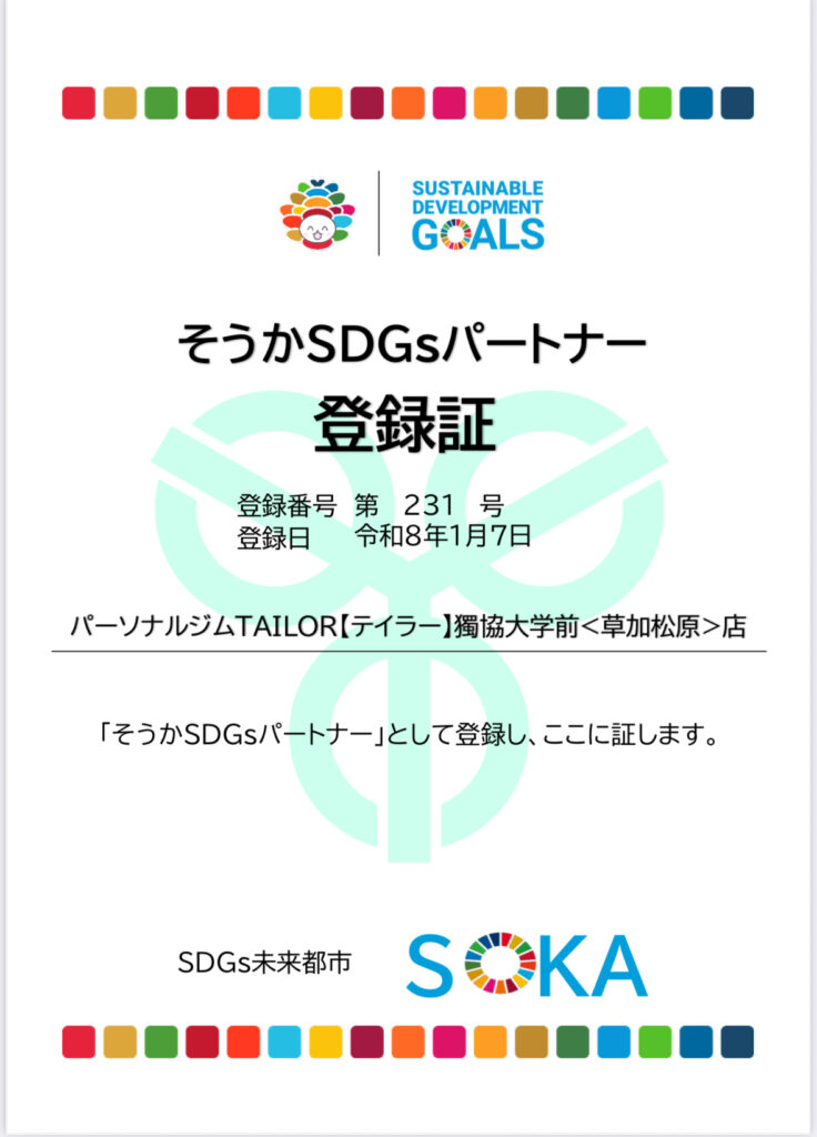 この度、パーソナルジムTAILOR【テイラー】獨協大学前〈草加松原〉店がSDGs宣言企業として草加市役所HPに掲載されました。