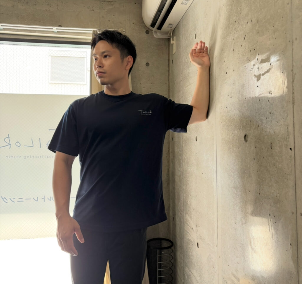 写真は壁を使って胸の筋肉を伸ばしています。